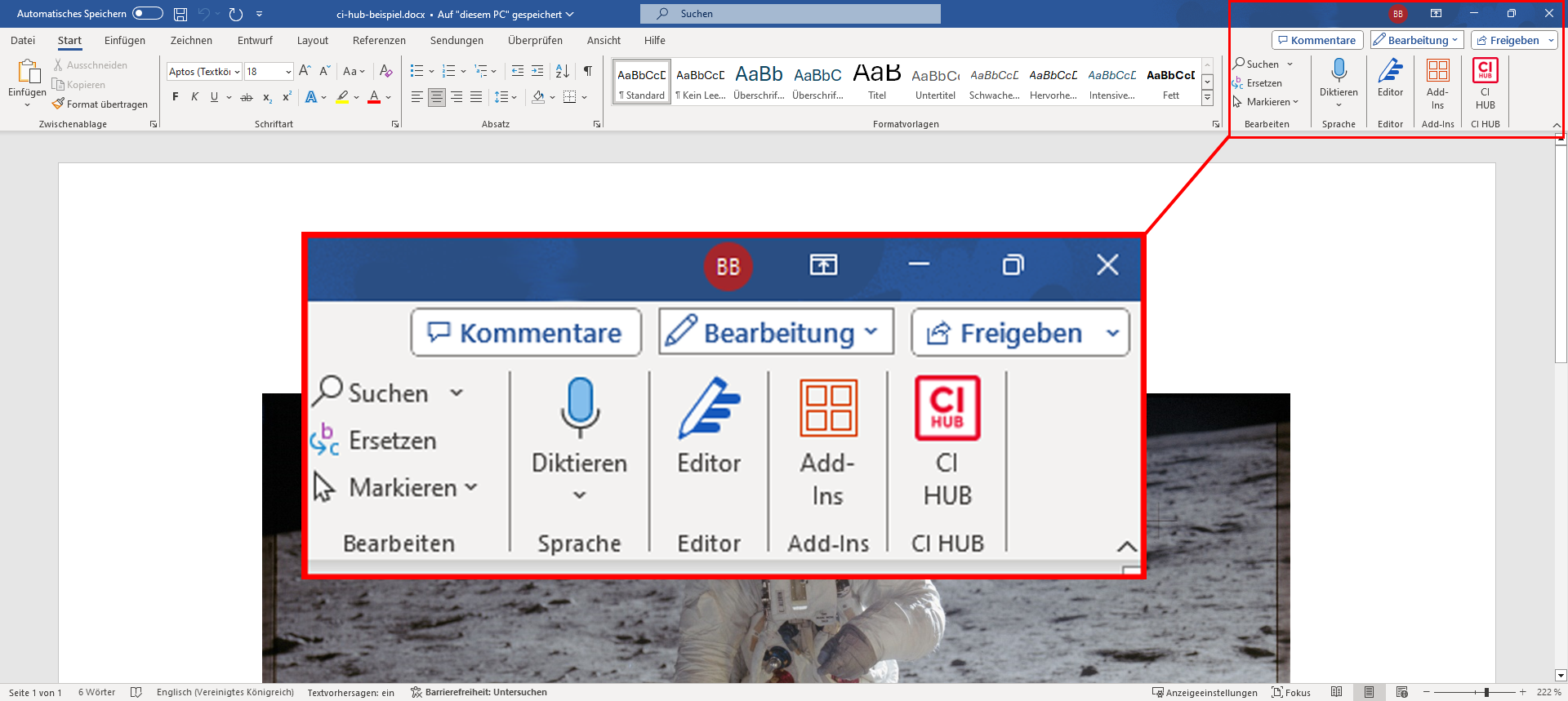 Für den Zugriff auf den Media Hub ist zunächst im Menüband rechts auf die rote Schaltfläche CI HUB zu klicken.
