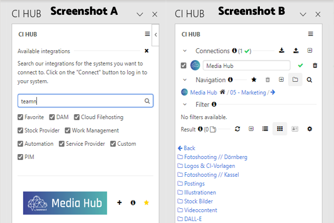 Ein Konnektor-Plugin von CI-Hub ermöglicht den Abruf und die Aktualisierung von im Media Hub gespeicherten Assets aus anderen Programmen. Unterstützt werden unter anderem die Anwendungen der Adobe Creative Cloud, von Microsoft 365 (ehem. Office 365) und vom Google Workspace.