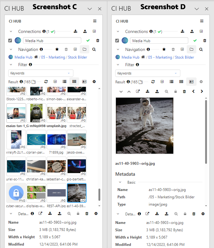 Der Media Hub lässt sich nun auf verschiedene Weisen nach gewünschten Assets durchsuchen, beispielsweise über die Ordneransicht, per Volltextsuche oder mit Keyword-Filtern (Screenshot C).