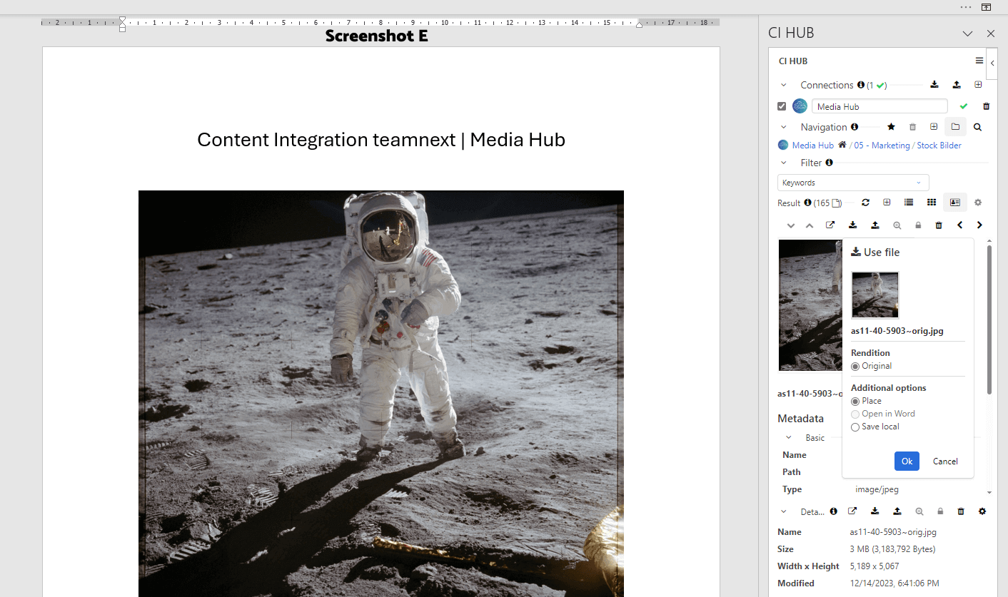 Der CI-Hub-Konnektor ermöglicht die Auswahl des Media Hubs in der bevorzugten Anwendung als Datenquelle. Das folgende Beispiel zeigt die Nutzung des Konnektors in Microsoft Word.