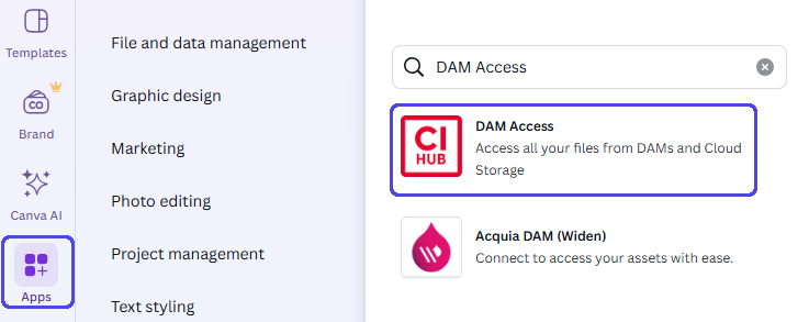 - In the Apps section (left sidebar), search for "DAM Access" or "CI Hub" and select from the list > Screenshot 1