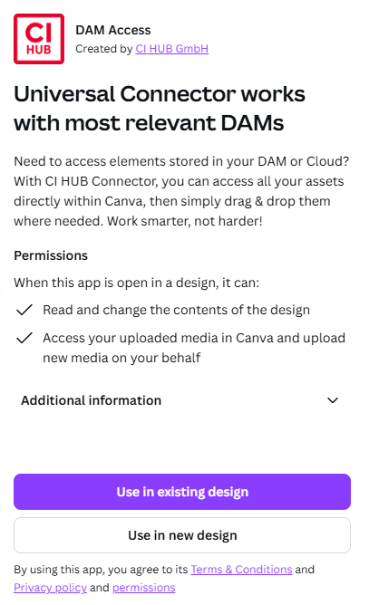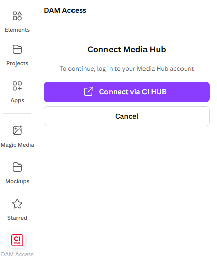 The CI Hub plugin for Canva ensures that your Media Hub is selectable as a data source from the Canva platform. (We assume here that the plugin has already been licenced and that a CI Hub account is available)